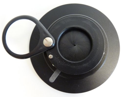 Blendfreie Dunkelfeld-Vorrichtung mit Farbfilterhalter und stufenlos-einstellbarer Irisblende für die Anwendung bei gemmologischen Proben, etwa bei Juwelieren, Mineralogen, Archäologen, Goldschmieden, Geologen etc. Es eignet sich beispielsweise zur Betrachtung von Edelsteinen.