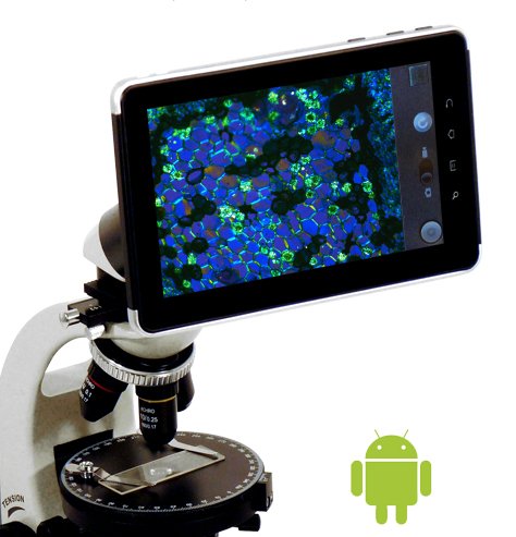 Unser CamPad-200 ist speziell für den Einsatz am Mikroskop entwickelt worden. Mit Android als Betriebssystem lässt es keine Wünsche offen. Optional lässt sich an das CamPad-200 für Präsentationen per HDMI ein Beamer oder ein großer Fernseher anschließen. Sie können ihre Bilder und Videos auch via USB 2.0 Schnittstelle auf den PC übertragen oder gleich per E-Mail an einen Freund oder Kollegen senden, Dank dem integrierten WLAN-Modul alles kein Problem.